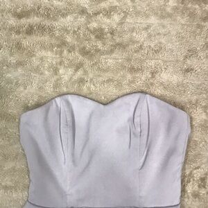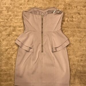 Light grey; sweetheart neckline; sleeveless; strapless; peplum detail; exposed back zipper; fully lined