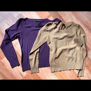 H&M lightweight stretch sweaters. One purple one tan. I bought these in Spain and they are labeled as European medium. These fit like a US Small.