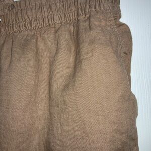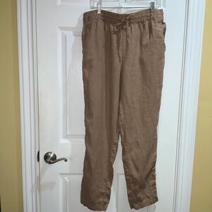 H&M tan linen straight leg elastic waist pants Sz L pockets drawstring