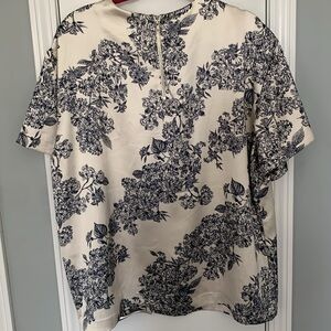 Silky, navy, and champagne color, oversize top. Goes well with jeans or dress pants. Zipper detail on the back. Comfortable and elegant. Great condition, washes well.