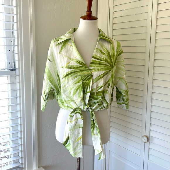 Lightweight plant print shirt, collared with deep V-neck and tie at hem. Loose, airy fit in a polyester blend. Great condition with no damage or stains. P2P: 21” Length: 16”