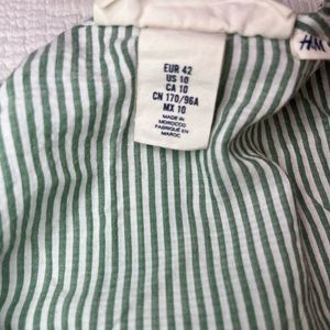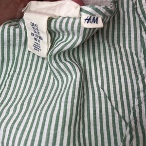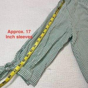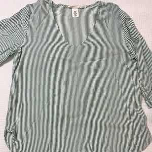 H&M women’s top, pinstriped material, looks like seersucker, loose fitting, curved hem with slight side split, hem is higher in front and slightly lower in back, sleeves have ties that be tied in knots or small bow, great for summer. Very small fabric pulls on bottom.