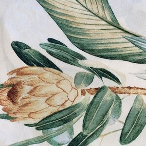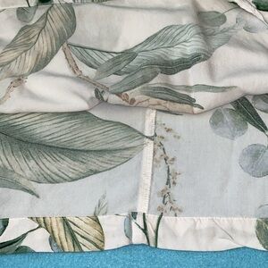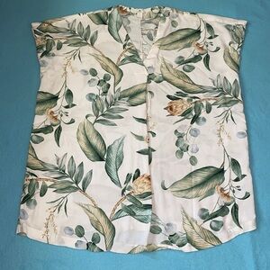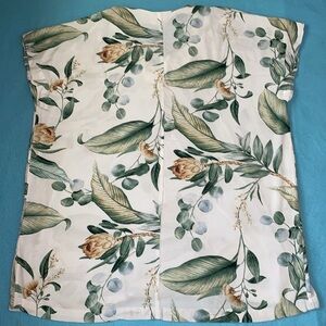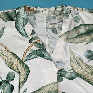 H&M tropical palm print shirt dress tunic swim cover pullover short sleeve, V-neck, pleated in front, above knee, soft, lightweight, unlined. Adorable with a belt or leggings. Can be dressed up or down!
