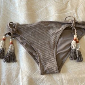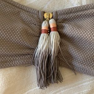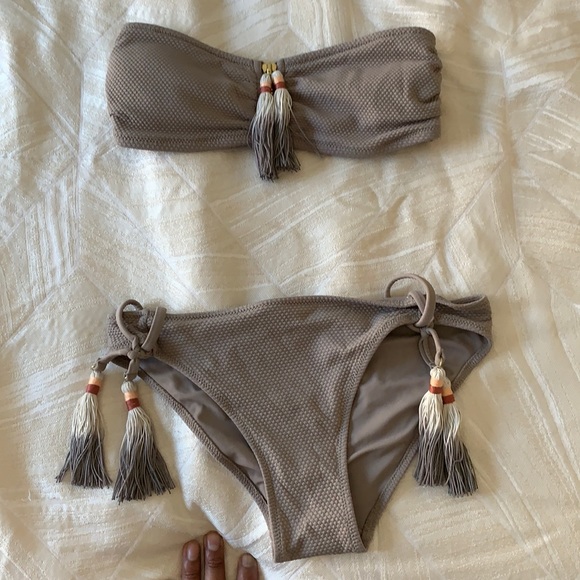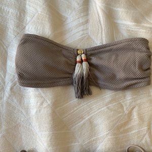 Gray strapless top that is a size 4. I am a size 32a in bra size. Bottom is size 2. I usually wear size 0. Had to size up for both