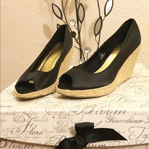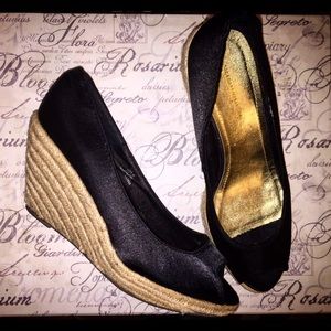 Satin peep toe with woven wedge. Size says 39 which is supposed to be a US 8, but they run a little big. Small discolored scuff mark on the inner side of the right shoe (in picture). Otherwise, beautiful!
