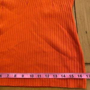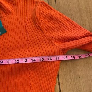 This is such a pretty bright orange knit sweater new with tags. It is turtleneck and long sleeves. It is stretchy and made of recycled polyester. I have measurements in the pictures and thank you for considering my item. 🌷