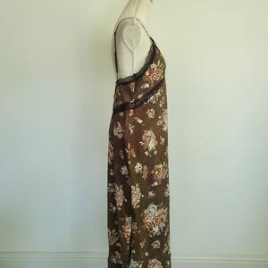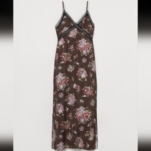 Brock Collection for H&M brown floral lyocell blend slip dress with woodgrain look, lace, side slits, side zipper, and adjustable straps.
