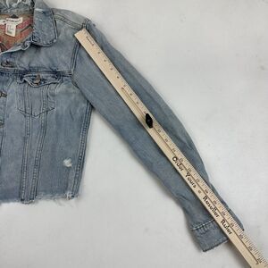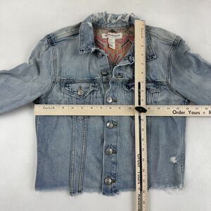 This is a denim blue jean jacket from the H&M x Coachella Official Collection. It has a distressed look and a button closure. The jacket has a collared neckline, long sleeves, and is a short length. It is made of cotton and is machine washable. The jacket is a size 8 and is designed for women. It is a basic jacket with a bohemian, hippie, and festival theme, suitable for travel, party/cocktail, casual, and workwear occasions. The jacket is suitable for all seasons, including winter, summer, fall, and spring.