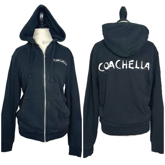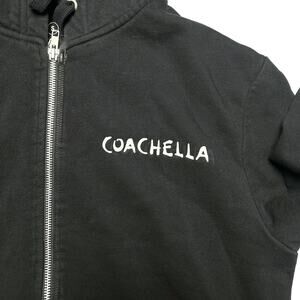 Pre-loved women’s H&M x Coachella washed black cozy full zip music festival logo hoodie with two pockets and hood with drawcord.