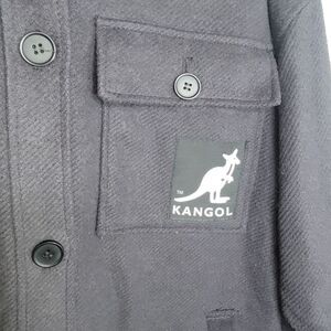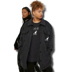 Oversized shirt Jacket in Thick Twill with brushed finished collar buttons at front and yoke at back and box pleat and locker loop welt front pockets and chest pockets with flap and chest pockets with flap and button one chest pockets with Kangol logo dropped shoulders long sleeves with button at cuffs and rounded hem with slits at sides Quilted lining made from recycled polyester