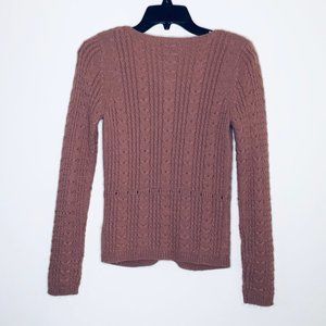 Dusty pink long sleeve button up cardigan sweater. Scoop neck. Small front pockets. Cable knit.