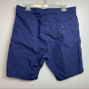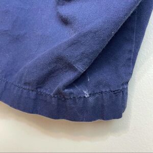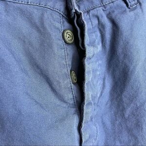 100% Cotton. Solid blue. Pockets. Belt loops. Zipper. Button. Great condition. Measurements are approximate. Waist laying flat 18 inches. Length 20 inches. Inseam 9.5 inches. Pre owned. No stains no holes no fades. Small rip on bottom as seen in picture.