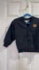 A classic black cardigan with a button-down front showcases a stylish emblem. It is ideal for layering.