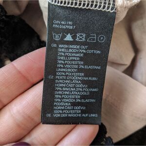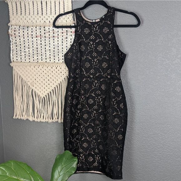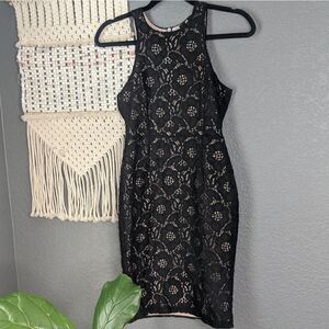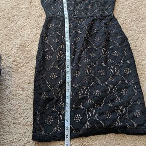 Tan lining that shows through a little on the black floral lace. Long silver zipper up the back. Size XS
