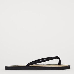 Black Sandals with faux suede straps. Braided straw insoles and fluted rubber soles.