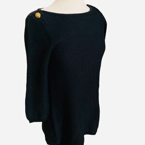 Has 2 gold buttons at the top of the shoulders and an extra button on the inside with the instructions.