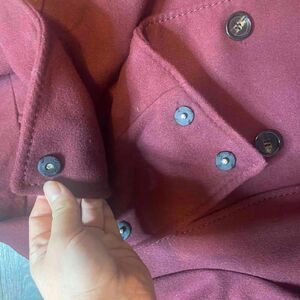 Features: Burgundy, Double-breasted, Button closure, Folded cuffs, Lined