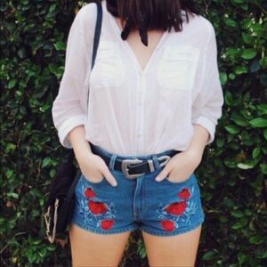 H&M Coachella High Waisted denim jean shorts with red roses