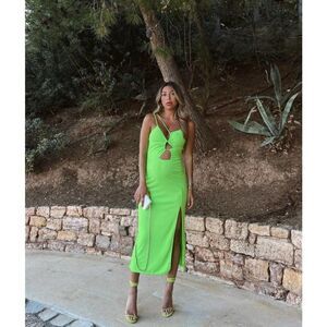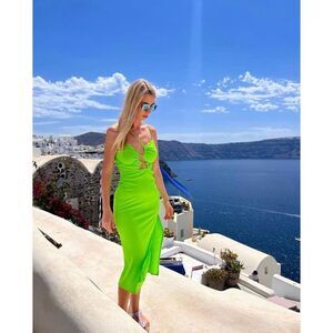 Sleeveless, calf-length dress in woven fabric. Extra-narrow shoulder straps and an extra shoulder strap finishing along bodice as a decorative drawstring. Bodice with asymmetric cut-out sections at front, a seam at waist, and high slit at front of skirt. Lined.