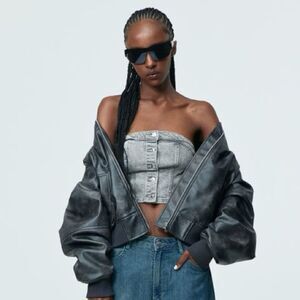 Fitted, bustier-style crop top in cotton denim with gentle stretch. Buttons at front and visible seams at front and back.