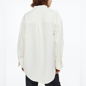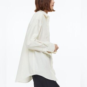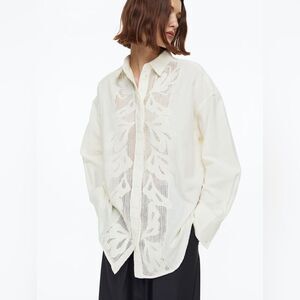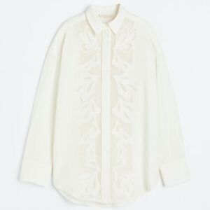 Slightly longer, loose-fit shirt in a woven cotton and linen blend. Mesh section at front with an embroidered design. Collar, concealed buttons at front, and yoke at back with box pleat. Dropped shoulders and long sleeves with button at cuffs. Rounded hem, slightly longer at back.