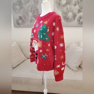 FM33 (tags: Xmas, Christmas, Holiday, Santa Claus, Gifts, candy cane, gifts, gift boxes, pullover, knit, knitted, red, festive, Ugly Christmas sweater, women's size XL, extra large)