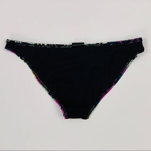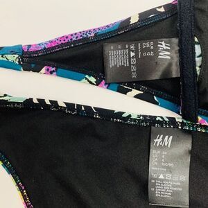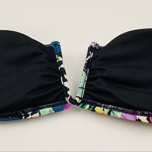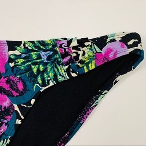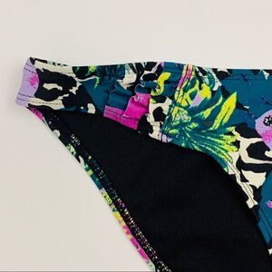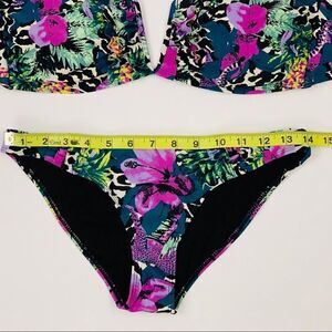 Base is black & white leopard print covered with green jungle flora and purple flowers. Several different shades of green and purple. A couple of cheetahs are subtly placed throughout. Bandeau top comes with removable halter neck string tie and padded inserts. The cleavage has a distinct “V-cut” designed with 3 vertical ruffles along the lining. Bottom also has matching ruffles on left and right side. Worn once.