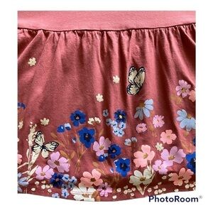 beautiful rust color dress with bright color flowers and butterflies along the bottom, excellent condition, size girls 8/10