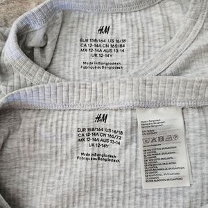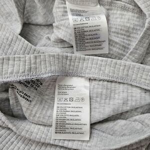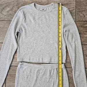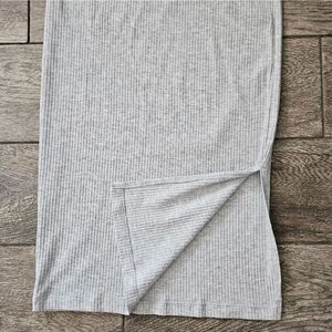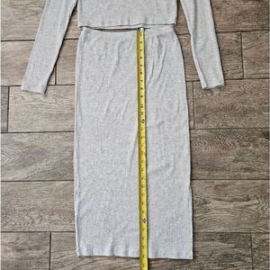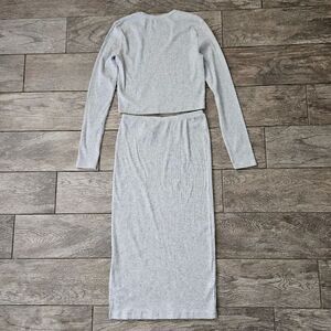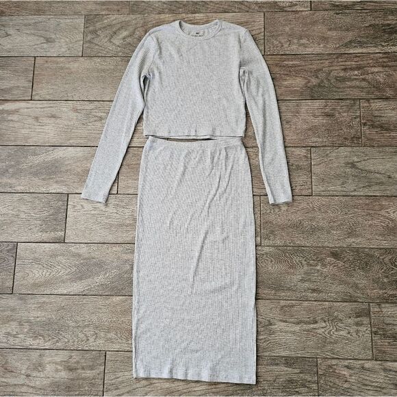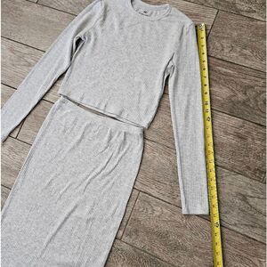 Stylish gray ribbed knit two-piece set. Includes a long-sleeve top and matching skirt. Perfect for a chic and comfortable look.