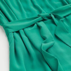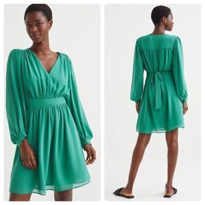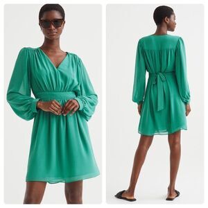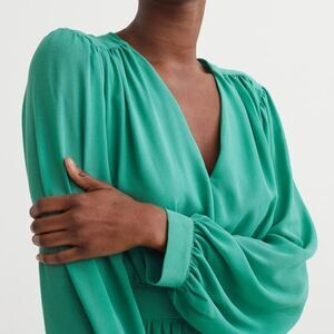 Short, V-neck dress in airy, woven fabric. Long balloon sleeves, narrow cuffs, and ties at back attached at sides. Gathered seams at shoulders, at front of waist, and at back. Partly lined.
