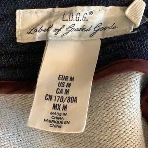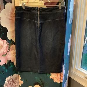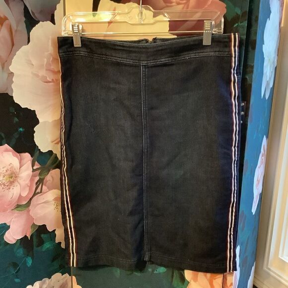 Denim stretch skirt with athletic striped detail. Zips is back. Size Medium. Cotton, poly, elastane.