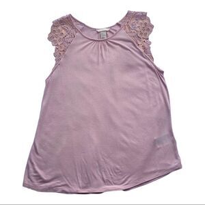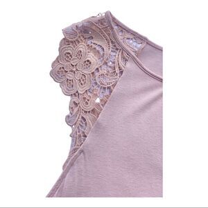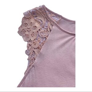 Light Pink/Dusty Rose color Short Sleeve, Round Neckline, Detailed With Rouching on Front Center, Lace Shoulders, and Round Hemline.