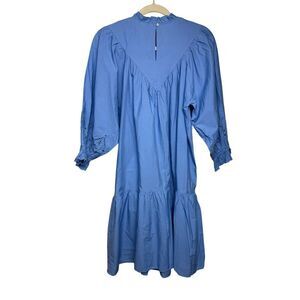 Short, loose-fit dress in crisp, woven cotton fabric with eyelet embroidered sections. Ruffle collar, keyhole opening at back of neck with a button, and a gathered, V-shaped yoke. 3/4-length balloon sleeves and elasticized cuffs with a scalloped-edge ruffle. Gathered tier at hem for a voluminous, A-line silhouette. Unlined.