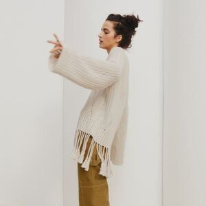 Long jumper in pattern-knit cotton. Relaxed fit with a deep V-neck, dropped shoulders, long, wide sleeves and twisted fringes at the hem.
