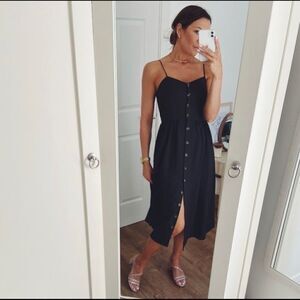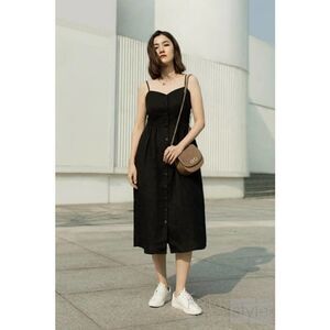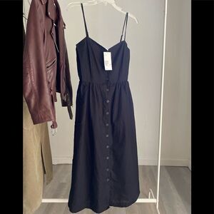 Calf-length dress in a woven linen and cotton blend. Gentle V-neck, narrow, adjustable shoulder straps, buttons full length of front, and smocking at back. Gathered seam at waist for added volume and soft draping. Lined.