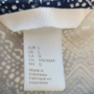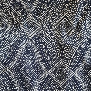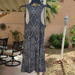 This casual sundress from H&M features a scoop neckline and a sleeveless design, perfect for warm days. The dress showcases a sophisticated geometric print in shades of navy blue and white, adding a touch of elegance to its casual style. Its midi length and flattering silhouette make it a versatile choice for various occasions.