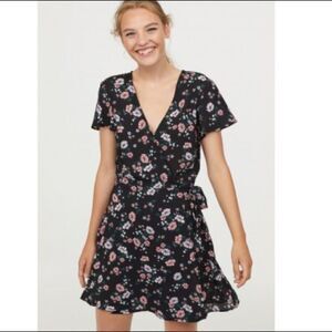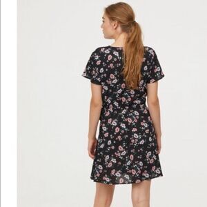 ✨ Short dress in woven, crêped fabric with a printed pattern. Wrapover front with concealed snap fasteners and ties at one side. Short, wide sleeves. Unlined.