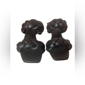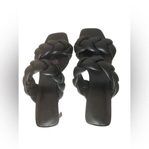 Slip-on sandals in faux leather with open, square toes, wide, braided foot straps, and covered heels. Faux leather lining and insoles. Heel height 2 in.