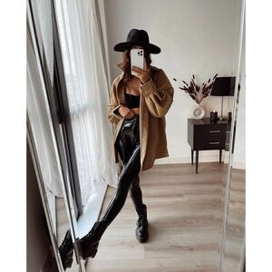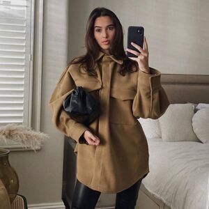 Oversized shirt jacket in woven, felted fabric. Collar, concealed snap fasteners at front, and yoke at back with box pleat. Large chest pockets with flap and concealed snap fastener, heavily dropped shoulders, and long sleeves with concealed snap fasteners at cuffs. Rounded hem. Unlined.