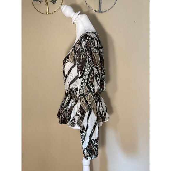 From H&M, this semi sheer top has an alternating print of different shades of snakeskin patterns. Deep V. Elasticated sleeves and waist.
