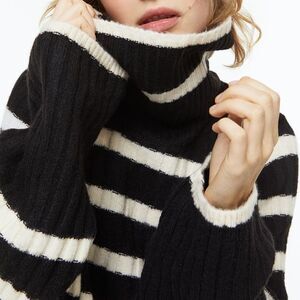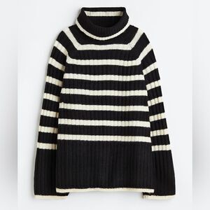 Rib-knit sweater with wool content. Turtleneck, long, wide raglan sleeves, and slit at sides.