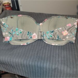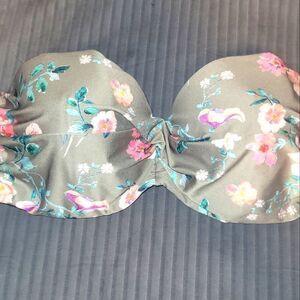 This stylish H&M swimsuit top features a beautiful floral pattern with pink, blue, and white flowers against a gray background, accented by green leaves. The bandeau style includes a charming ruching detail in the center, creating a flattering gathered effect. Previously owned but in excellent condition, this swimsuit top is perfect for adding a touch of elegance to your beach or poolside look.