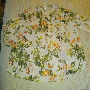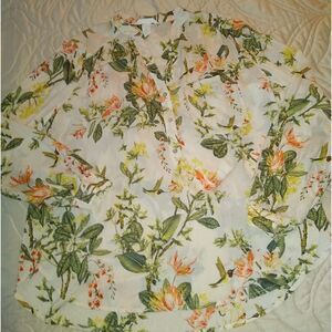 H&M size 8 floral top, v neck, long sleeves, button front, pocket detail, cuff sleeves, 42" bust, 26" long. ivory background w orange flowers, green hummingbirds, viscose. Great casual or BOHO top.