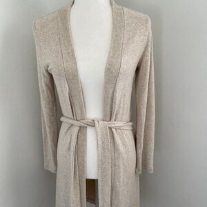 Ultra-soft cardigan with wrap ties. Ribbed front detail and longline detail in the back.