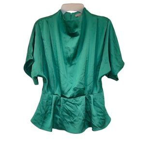 H&M Women's Turquoise Green Poly Satin Charmeuse Stand Collar Short Batwing Sleeve w Peplum Top EUC sz S