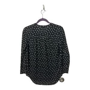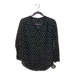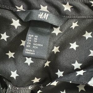 Trendy H&M women’s button-down shirt in size XS. Features a black base with an allover white star print, relaxed fit, long sleeves, and a classic collar. Made in Vietnam.