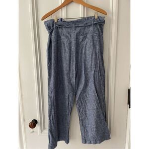 H&M blue chambray pants size 10, gathered at waist. zips and ties with belt, lightweight cotton and linen blend, waist is approximately 15.5 inches, rise approximately 14 inches, inseam is approximately 21 inches, cropped
