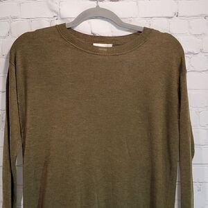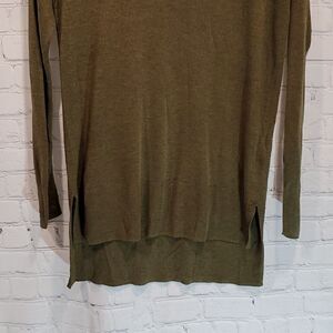 In very good used condition minor piling no flaws. Dark army green with a crewneck. High low hem and split sleeve cuffs. Very lightweight.