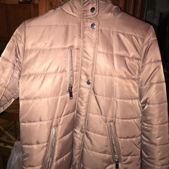 Mauve hooded coat with fur trimmed hood