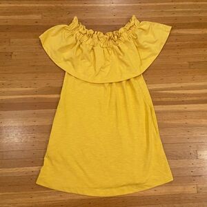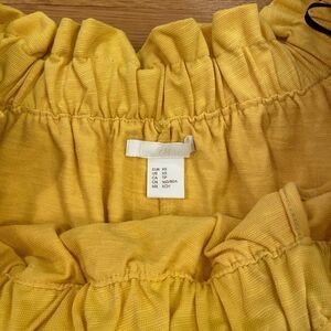 H&M yellow off the shoulder ruffle dress. Elastic stretch neckline. 2 pockets. 64% cotton, 34% polyester, 2% elastane. Length 29 inches. Size XS. Excellent condition!